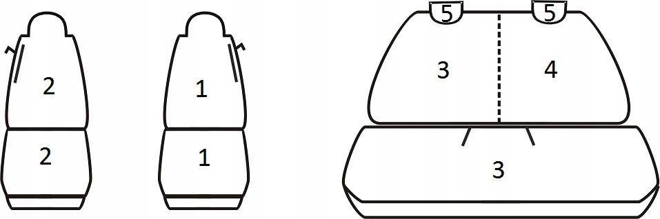 Zestaw pokrowców powstał na podstawie konkretnego modelu auta (rocznika) i pasuje tylko i wyłącznie do podanej powyżej konfiguracji siedzeń - nie jest to komplet uniwersalny. Profil, rozmiar oraz kształt foteli został uwzględniony podczas przygotowywania konkretnego produktu. Wszystkie typowe otwory zostały przygotowane i obszyte. Podłokietniki (o ile występują) zostały uwzględnione - w pierwszym rzędzie są osobne pokrowce, w kanapach zastosowano zamki błyskawiczne w odpowiednim miejscu (brak osobnego pokrowca na podłokietnik). Przednie fotele posiadają wszyte zamki błyskawiczne na plecach umożliwiające na korzystanie z kieszeni, dodatkowo w fotelu kierowcy (w siedzisku) przygotowano praktyczną kieszonkę na drobne przedmioty.