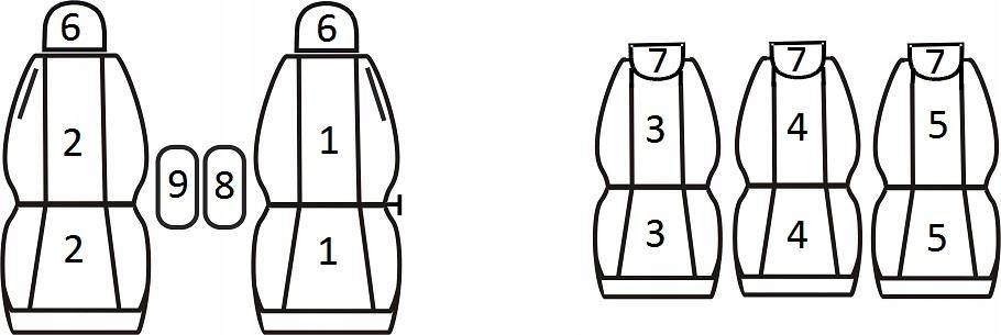 Zestaw pokrowców powstał na podstawie konkretnego modelu auta (rocznika) i pasuje tylko i wyłącznie do podanej powyżej konfiguracji siedzeń - nie jest to komplet uniwersalny. Profil, rozmiar oraz kształt foteli został uwzględniony podczas przygotowywania konkretnego produktu. Wszystkie typowe otwory zostały przygotowane i obszyte. Podłokietniki (o ile występują) zostały uwzględnione - w pierwszym rzędzie są osobne pokrowce, w kanapach zastosowano zamki błyskawiczne w odpowiednim miejscu (brak osobnego pokrowca na podłokietnik). Przednie fotele posiadają wszyte zamki błyskawiczne na plecach umożliwiające na korzystanie z kieszeni, dodatkowo w fotelu kierowcy (w siedzisku) przygotowano praktyczną kieszonkę na drobne przedmioty.