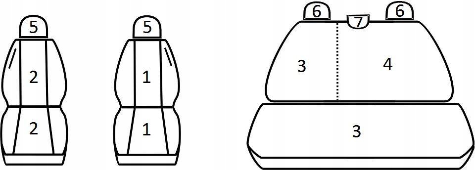 Zestaw pokrowców powstał na podstawie konkretnego modelu auta (rocznika) i pasuje tylko i wyłącznie do podanej powyżej konfiguracji siedzeń - nie jest to komplet uniwersalny. Profil, rozmiar oraz kształt foteli został uwzględniony podczas przygotowywania konkretnego produktu. Wszystkie typowe otwory zostały przygotowane i obszyte. Podłokietniki (o ile występują) zostały uwzględnione - w pierwszym rzędzie są osobne pokrowce, w kanapach zastosowano zamki błyskawiczne w odpowiednim miejscu (brak osobnego pokrowca na podłokietnik). Przednie fotele posiadają wszyte zamki błyskawiczne na plecach umożliwiające na korzystanie z kieszeni, dodatkowo w fotelu kierowcy (w siedzisku) przygotowano praktyczną kieszonkę na drobne przedmioty.