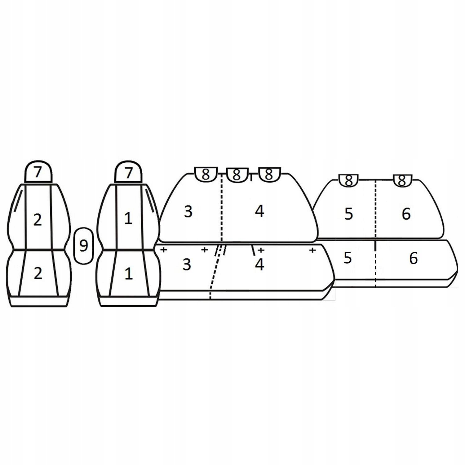Zestaw pokrowców powstał na podstawie konkretnego modelu auta (rocznika) i pasuje tylko i wyłącznie do podanej powyżej konfiguracji siedzeń - nie jest to komplet uniwersalny. Profil, rozmiar oraz kształt foteli został uwzględniony podczas przygotowywania konkretnego produktu. Wszystkie typowe otwory zostały przygotowane i obszyte. Podłokietniki (o ile występują) zostały uwzględnione - w pierwszym rzędzie są osobne pokrowce, w kanapach zastosowano zamki błyskawiczne w odpowiednim miejscu (brak osobnego pokrowca na podłokietnik). Przednie fotele posiadają wszyte zamki błyskawiczne na plecach umożliwiające na korzystanie z kieszeni, dodatkowo w fotelu kierowcy (w siedzisku) przygotowano praktyczną kieszonkę na drobne przedmioty.