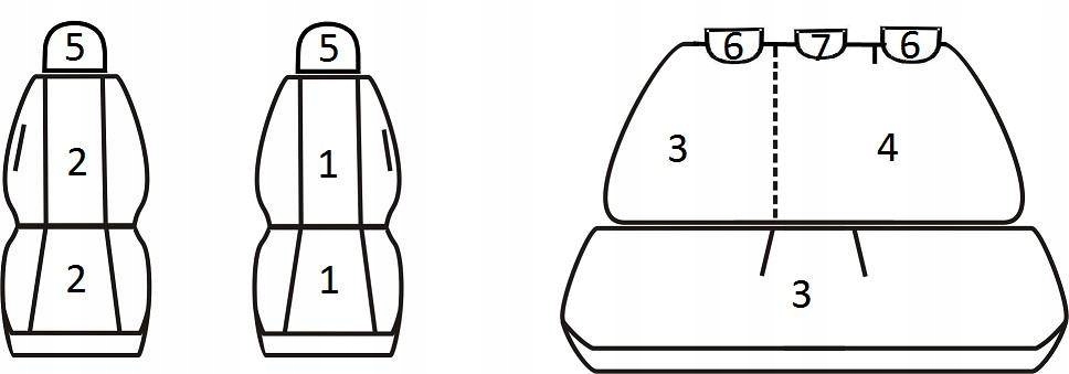 Zestaw pokrowców powstał na podstawie konkretnego modelu auta (rocznika) i pasuje tylko i wyłącznie do podanej powyżej konfiguracji siedzeń - nie jest to komplet uniwersalny. Profil, rozmiar oraz kształt foteli został uwzględniony podczas przygotowywania konkretnego produktu. Wszystkie typowe otwory zostały przygotowane i obszyte. Podłokietniki (o ile występują) zostały uwzględnione - w pierwszym rzędzie są osobne pokrowce, w kanapach zastosowano zamki błyskawiczne w odpowiednim miejscu (brak osobnego pokrowca na podłokietnik). Przednie fotele posiadają wszyte zamki błyskawiczne na plecach umożliwiające na korzystanie z kieszeni, dodatkowo w fotelu kierowcy (w siedzisku) przygotowano praktyczną kieszonkę na drobne przedmioty.