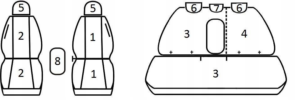 Zestaw pokrowców powstał na podstawie konkretnego modelu auta (rocznika) i pasuje tylko i wyłącznie do podanej powyżej konfiguracji siedzeń - nie jest to komplet uniwersalny. Profil, rozmiar oraz kształt foteli został uwzględniony podczas przygotowywania konkretnego produktu. Wszystkie typowe otwory zostały przygotowane i obszyte. Podłokietniki (o ile występują) zostały uwzględnione - w pierwszym rzędzie są osobne pokrowce, w kanapach zastosowano zamki błyskawiczne w odpowiednim miejscu (brak osobnego pokrowca na podłokietnik). Przednie fotele posiadają wszyte zamki błyskawiczne na plecach umożliwiające na korzystanie z kieszeni, dodatkowo w fotelu kierowcy (w siedzisku) przygotowano praktyczną kieszonkę na drobne przedmioty.