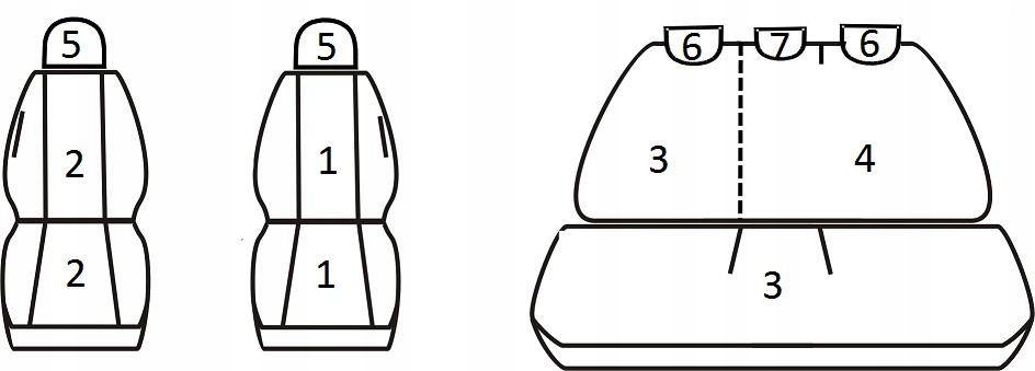 Zestaw pokrowców powstał na podstawie konkretnego modelu auta (rocznika) i pasuje tylko i wyłącznie do podanej powyżej konfiguracji siedzeń - nie jest to komplet uniwersalny. Profil, rozmiar oraz kształt foteli został uwzględniony podczas przygotowywania konkretnego produktu. Wszystkie typowe otwory zostały przygotowane i obszyte. Podłokietniki (o ile występują) zostały uwzględnione - w pierwszym rzędzie są osobne pokrowce, w kanapach zastosowano zamki błyskawiczne w odpowiednim miejscu (brak osobnego pokrowca na podłokietnik). Przednie fotele posiadają wszyte zamki błyskawiczne na plecach umożliwiające na korzystanie z kieszeni, dodatkowo w fotelu kierowcy (w siedzisku) przygotowano praktyczną kieszonkę na drobne przedmioty.