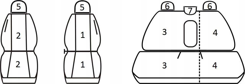 Zestaw pokrowców powstał na podstawie konkretnego modelu auta (rocznika) i pasuje tylko i wyłącznie do podanej powyżej konfiguracji siedzeń - nie jest to komplet uniwersalny. Profil, rozmiar oraz kształt foteli został uwzględniony podczas przygotowywania konkretnego produktu. Wszystkie typowe otwory zostały przygotowane i obszyte. Podłokietniki (o ile występują) zostały uwzględnione - w pierwszym rzędzie są osobne pokrowce, w kanapach zastosowano zamki błyskawiczne w odpowiednim miejscu (brak osobnego pokrowca na podłokietnik). Przednie fotele posiadają wszyte zamki błyskawiczne na plecach umożliwiające na korzystanie z kieszeni, dodatkowo w fotelu kierowcy (w siedzisku) przygotowano praktyczną kieszonkę na drobne przedmioty.
