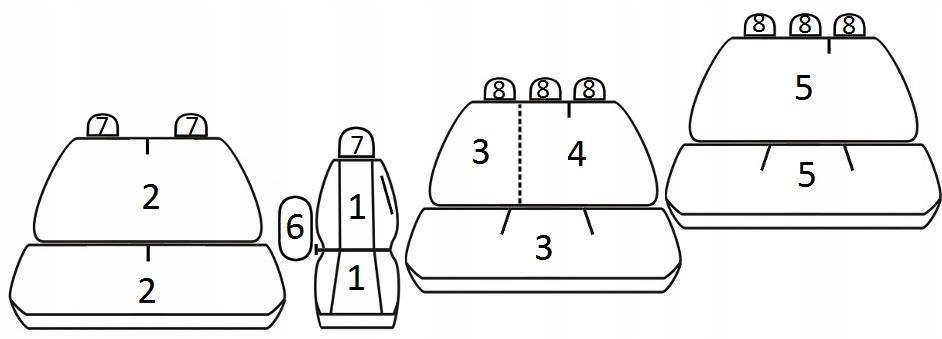 Zestaw pokrowców powstał na podstawie konkretnego modelu auta (rocznika) i pasuje tylko i wyłącznie do podanej powyżej konfiguracji siedzeń - nie jest to komplet uniwersalny. Profil, rozmiar oraz kształt foteli został uwzględniony podczas przygotowywania konkretnego produktu. Wszystkie typowe otwory zostały przygotowane i obszyte. Podłokietniki (o ile występują) zostały uwzględnione - w pierwszym rzędzie są osobne pokrowce, w kanapach zastosowano zamki błyskawiczne w odpowiednim miejscu (brak osobnego pokrowca na podłokietnik). Przednie fotele posiadają wszyte zamki błyskawiczne na plecach umożliwiające na korzystanie z kieszeni, dodatkowo w fotelu kierowcy (w siedzisku) przygotowano praktyczną kieszonkę na drobne przedmioty.