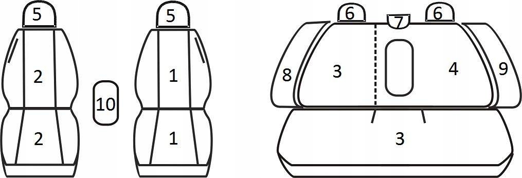 Zestaw pokrowców powstał na podstawie konkretnego modelu auta (rocznika) i pasuje tylko i wyłącznie do podanej powyżej konfiguracji siedzeń - nie jest to komplet uniwersalny. Profil, rozmiar oraz kształt foteli został uwzględniony podczas przygotowywania konkretnego produktu. Wszystkie typowe otwory zostały przygotowane i obszyte. Podłokietniki (o ile występują) zostały uwzględnione - w pierwszym rzędzie są osobne pokrowce, w kanapach zastosowano zamki błyskawiczne w odpowiednim miejscu (brak osobnego pokrowca na podłokietnik). Przednie fotele posiadają wszyte zamki błyskawiczne na plecach umożliwiające na korzystanie z kieszeni, dodatkowo w fotelu kierowcy (w siedzisku) przygotowano praktyczną kieszonkę na drobne przedmioty.