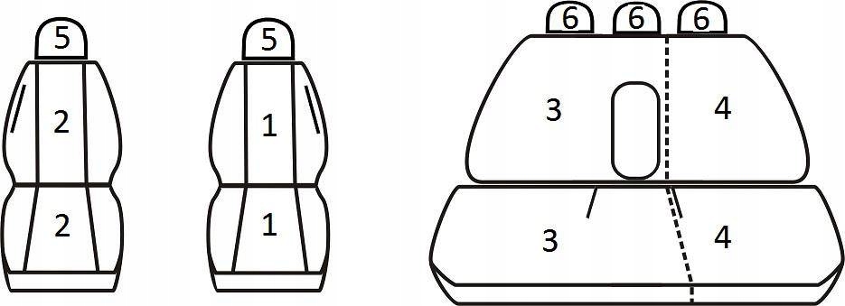 Zestaw pokrowców powstał na podstawie konkretnego modelu auta (rocznika) i pasuje tylko i wyłącznie do podanej powyżej konfiguracji siedzeń - nie jest to komplet uniwersalny. Profil, rozmiar oraz kształt foteli został uwzględniony podczas przygotowywania konkretnego produktu. Wszystkie typowe otwory zostały przygotowane i obszyte. Podłokietniki (o ile występują) zostały uwzględnione - w pierwszym rzędzie są osobne pokrowce, w kanapach zastosowano zamki błyskawiczne w odpowiednim miejscu (brak osobnego pokrowca na podłokietnik). Przednie fotele posiadają wszyte zamki błyskawiczne na plecach umożliwiające na korzystanie z kieszeni, dodatkowo w fotelu kierowcy (w siedzisku) przygotowano praktyczną kieszonkę na drobne przedmioty.