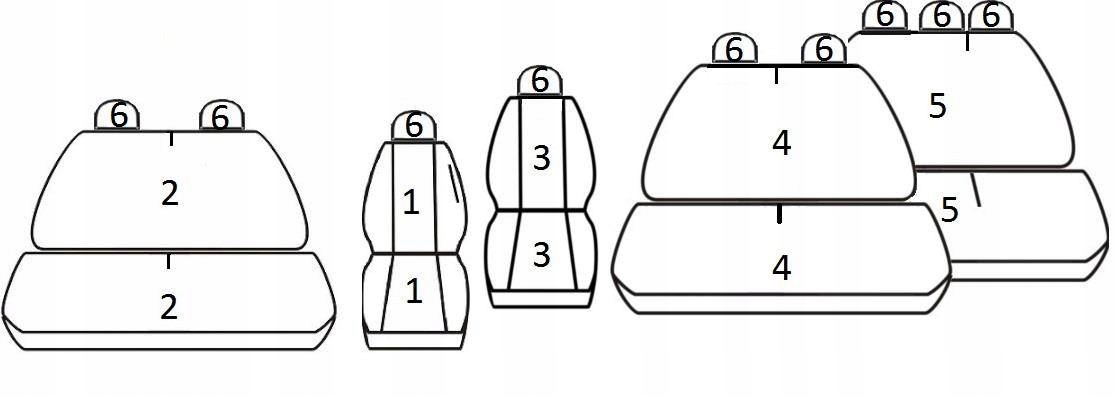 Zestaw pokrowców powstał na podstawie konkretnego modelu auta (rocznika) i pasuje tylko i wyłącznie do podanej powyżej konfiguracji siedzeń - nie jest to komplet uniwersalny. Profil, rozmiar oraz kształt foteli został uwzględniony podczas przygotowywania konkretnego produktu. Wszystkie typowe otwory zostały przygotowane i obszyte. Podłokietniki (o ile występują) zostały uwzględnione - w pierwszym rzędzie są osobne pokrowce, w kanapach zastosowano zamki błyskawiczne w odpowiednim miejscu (brak osobnego pokrowca na podłokietnik). Przednie fotele posiadają wszyte zamki błyskawiczne na plecach umożliwiające na korzystanie z kieszeni, dodatkowo w fotelu kierowcy (w siedzisku) przygotowano praktyczną kieszonkę na drobne przedmioty.