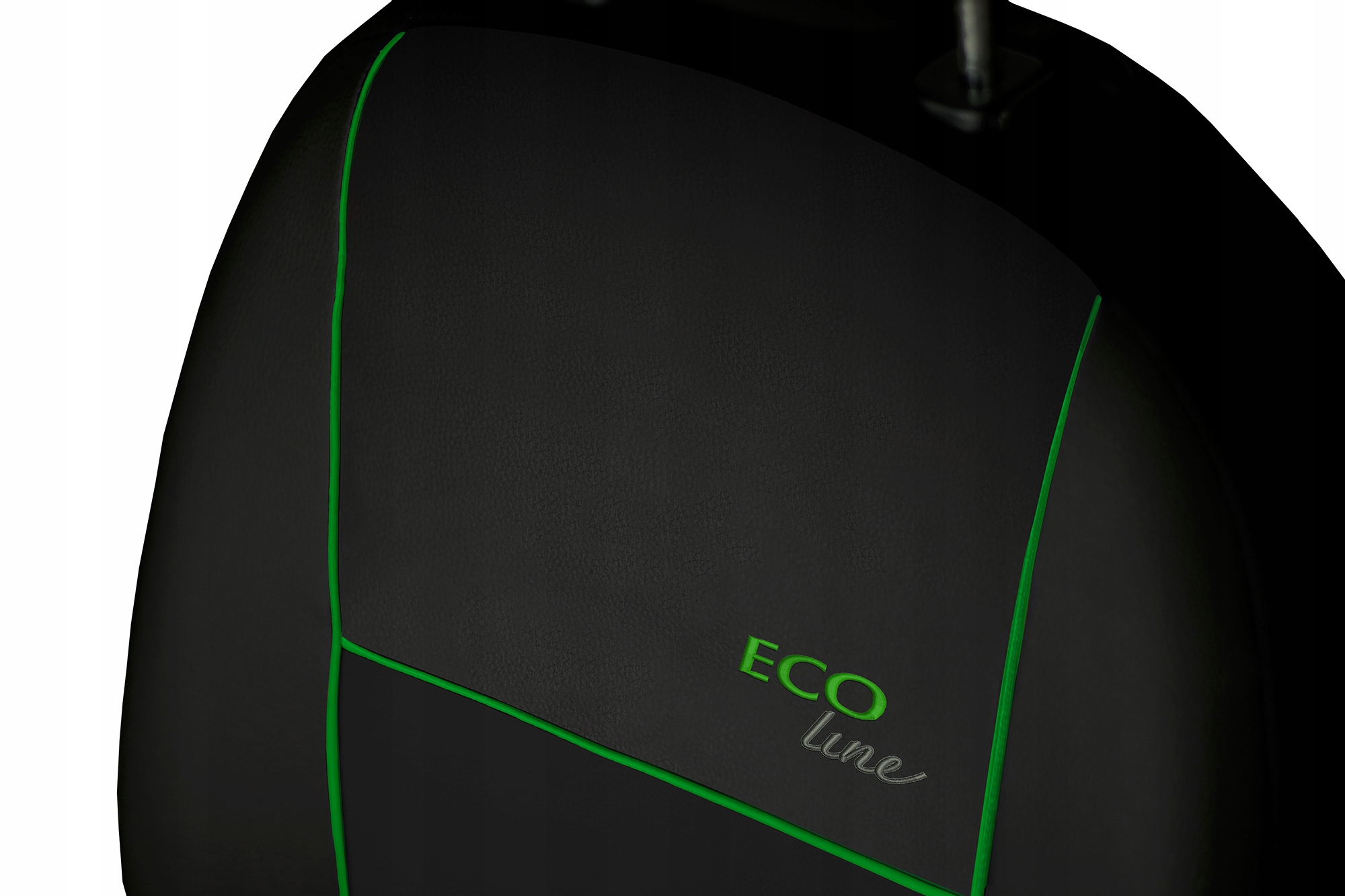 Pokrowce serii Ecoline zostały uszyte z wysokiej jakości ekoskóry (części przednie) oraz z dzianiny poliestrowej w kolorze czarnym (plecy, boki oraz zagłówki). Użyta ekoskóra jest materiałem mocnym, odpornym na ścieranie i uszkodzenia mechaniczne oraz nieprzemakalnym, przez co jest bardzo łatwa w utrzymaniu czystości. Materiał nie farbuje, nie powoduje alergii. Plecy pokrowców przednich foteli są pełne, standardowo zastosowano szew airbag. Na frontach dwóch przednich fotelach wszyto napis Ecoline. Poszczególne elementy wzmocniono lamówką. Polski produkt firmy z ponad 20 letnim doświadczeniem - firma Pokter