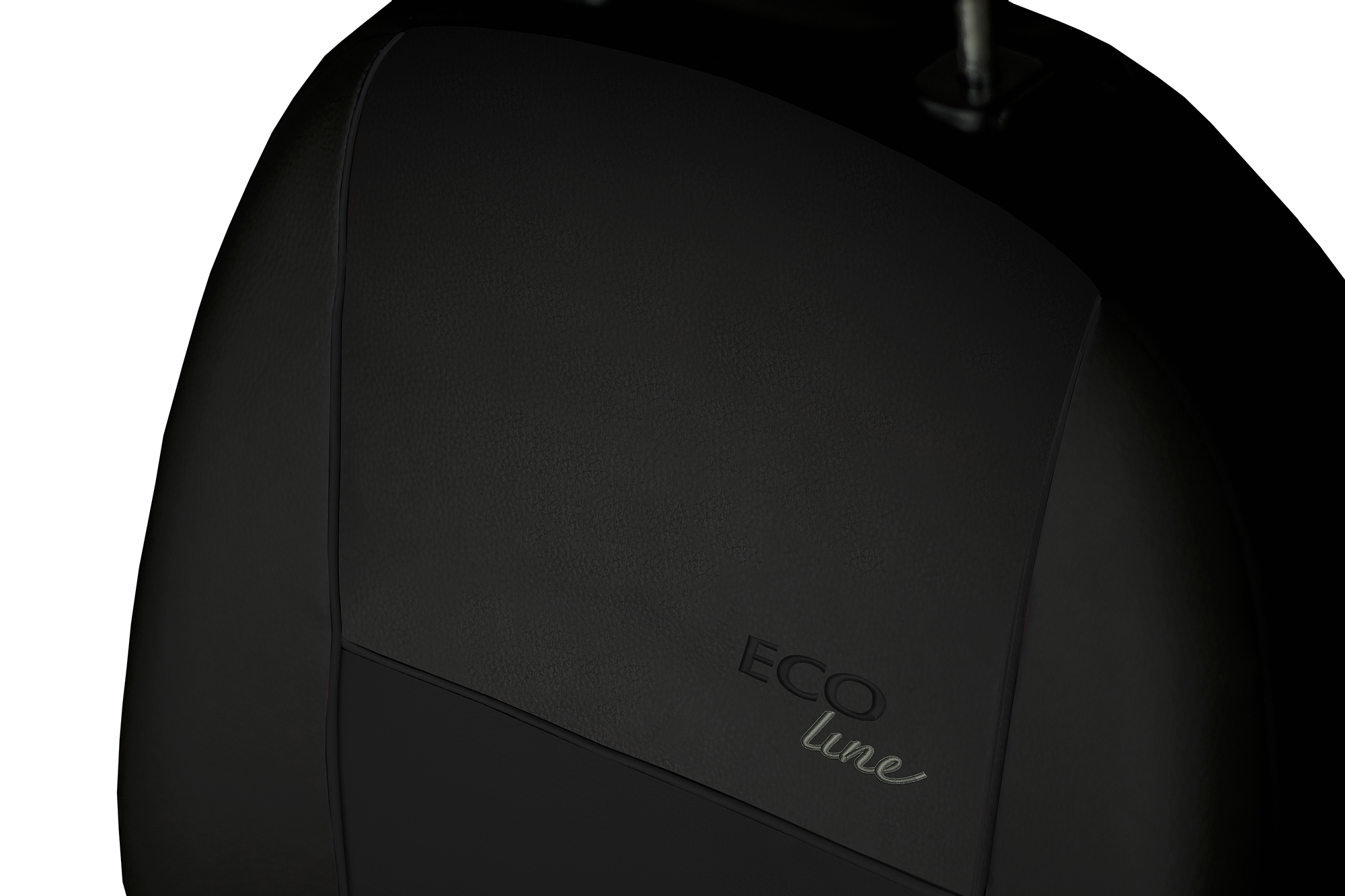 Pokrowce serii Ecoline zostały uszyte z wysokiej jakości ekoskóry (części przednie) oraz z dzianiny poliestrowej w kolorze czarnym (plecy, boki oraz zagłówki). Użyta ekoskóra jest materiałem mocnym, odpornym na ścieranie i uszkodzenia mechaniczne oraz nieprzemakalnym, przez co jest bardzo łatwa w utrzymaniu czystości. Materiał nie farbuje, nie powoduje alergii. Plecy pokrowców przednich foteli są pełne, standardowo zastosowano szew airbag. Na frontach dwóch przednich fotelach wszyto napis Ecoline. Poszczególne elementy wzmocniono lamówką. Polski produkt firmy z ponad 20 letnim doświadczeniem - firma Pokter