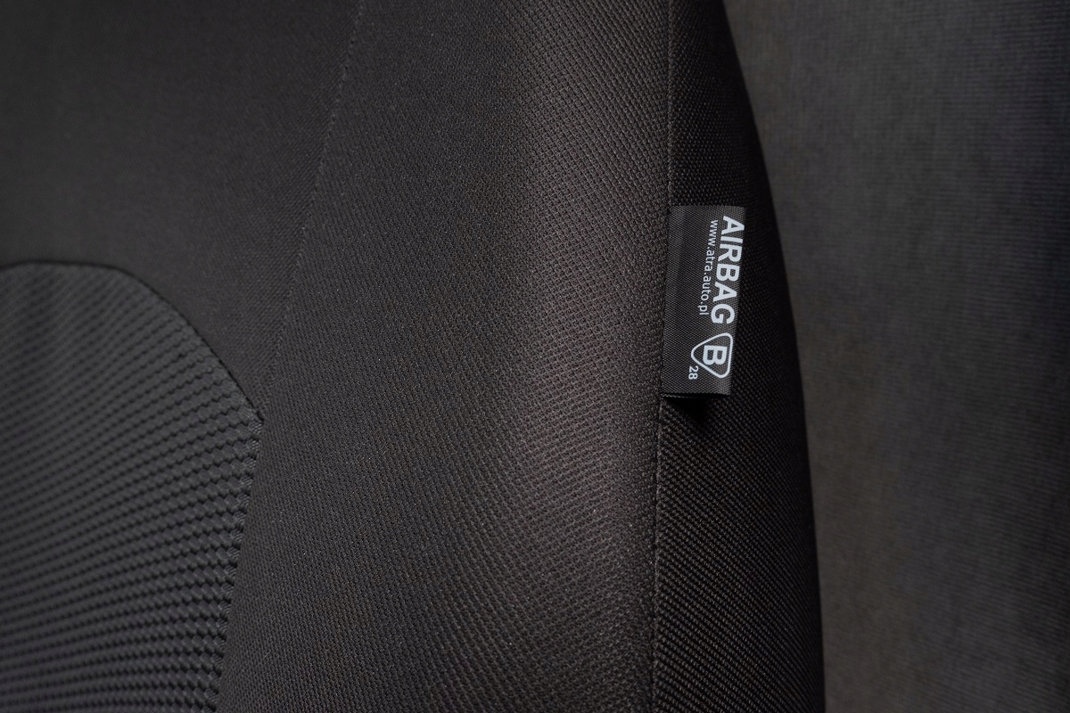 Pokrowce wykonano z wysokiej jakości dzianiny tapicerskiej (poliestrowej) w kolorze ciemnoszarym/grafitowym (główny materiał - w tym zagłówki). Wypełnienie (środkowy pas) uszyto z gładkiego materiału typu żakardowego o oryginalnym wzorze. Materiał jest laminowany 3mm pianką poliuretanową oraz podszewką, uniemożliwiając przesuwanie i marszczenie się pokrowców. Dzięki zastosowaniu regulowanych rzep w przednich fotelach, nie ma potrzeby wykonywania otworów na zagłówki. W pokrowcach uwzględniono poduszki AIRBAG. Zastosowany materiał - ze względu na jego elastyczność - pozwala na bardzo dobre dopasowanie pokrowców do foteli samochodu. Pokrowce posiadają wycięcia na pasy w kanapie podwójnej, dzięki czemu łatwiej je dopasować, bez konieczności dodatkowych przeróbek.
