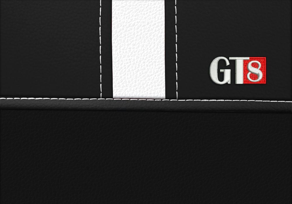 Pokrowce serii GT8 zostały uszyte w częściach przednich z wysokiej jakości ekoskóry oraz alkantary (syntetycznej odmiany zamszu) w pasach środkowych (w kolorze czarnym). Materiały są dodatkowo laminowane i podszyte pianką. Dzianina poliestrowa w kolorze czarnym została użyta do pleców, boków oraz zagłówków. Użyta ekoskóra i miękka alkantara są materiałami mocnymi, odpornymi na ścieranie i uszkodzenia mechaniczne, przez co pokrowce są bardzo łatwe w utrzymaniu czystości. W przednich częściach pokrowców przygotowano haft GT8, a poszczególne elementy połączono grubym, podwójnym szyciem. Materiał nie farbuje, nie powoduje alergii. Plecy pokrowców przednich foteli są pełne, standardowo zastosowano szew airbag. Polski produkt firmy z ponad 20 letnim doświadczeniem - firma Pokter