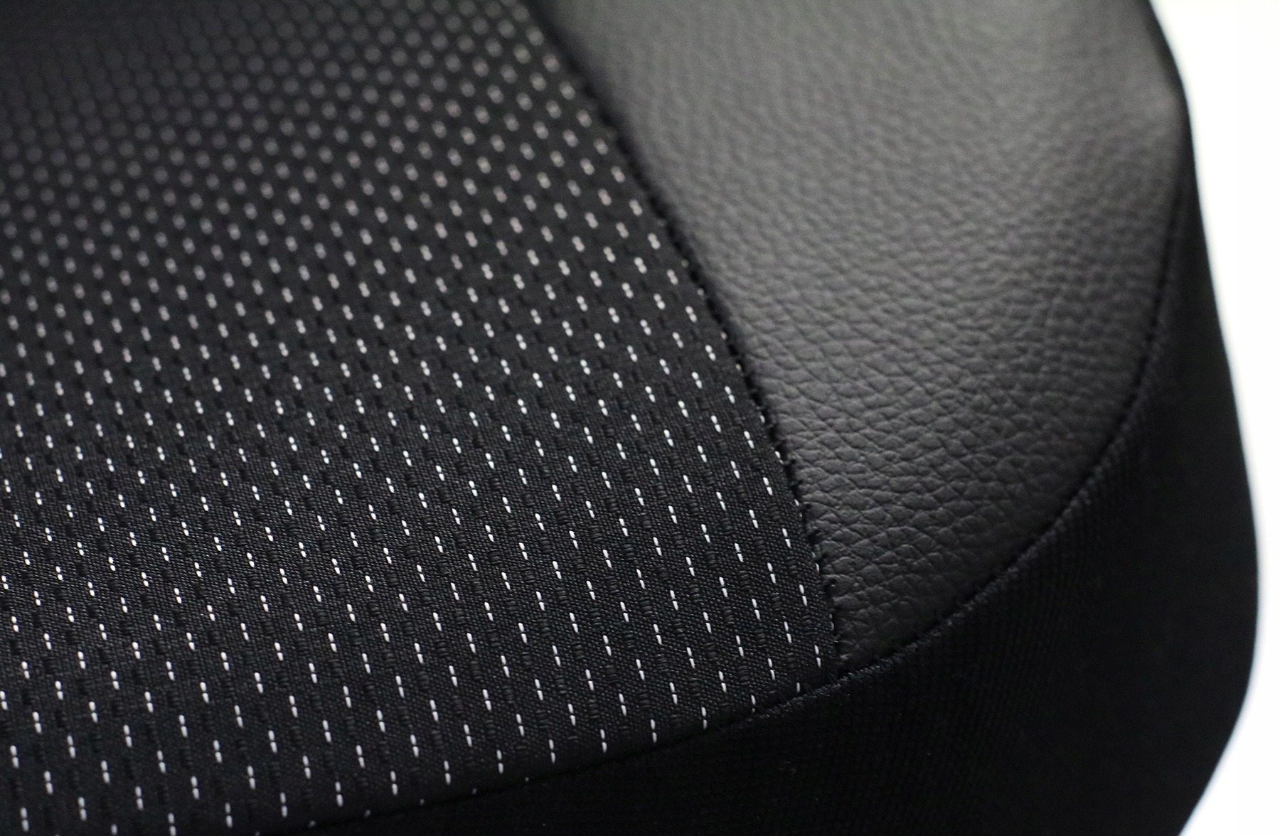 Pokrowce ROYAL są synonimem jakości. Wykonane z wysokogatunkowej ekoskóry, laminowanej pianką oraz stabilizującą podszewką, zapewniają długotrwałą eksploatację, niezależnie od pory roku. Czarne elementy ekoskóry świetnie chronią przed przetarciami i zabrudzeniami, a trwałe tkaniny tapicerskie na środkowych częściach gwarantują nie tylko stylowy wygląd, ale również najwyższy komfort użytkowania.