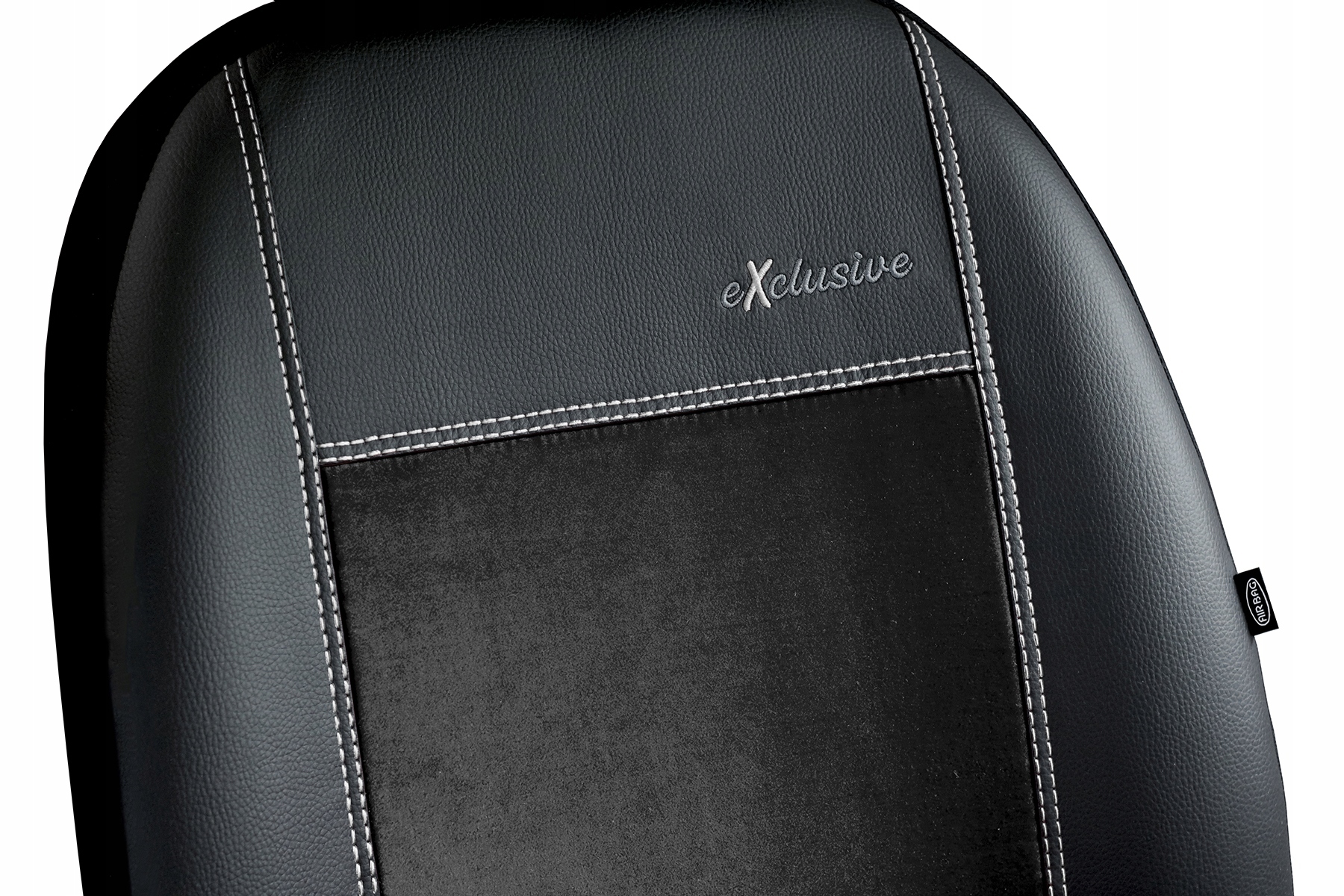 Pokrowce serii Exclusive Akantara zostały uszyte w części przedniej z wysokiej jakości ekoskóry (w kolorze czarnym) oraz alkantary (syntetycznej odmiany zamszu) w pasie środkowym. Materiały są dodatkowo laminowane i podszyte pianką. Dzianina poliestrowa w kolorze czarnym została użyta do pleców, boków oraz zagłówków. Użyta ekoskóra i miękka alkantara są materiałami mocnymi, odpornymi na ścieranie i uszkodzenia mechaniczne, przez co pokrowce są bardzo łatwe w utrzymaniu czystości. W przednich częściach pokrowców przygotowano haft eXclusive, a poszczególne elementy połączono grubym, podwójnym szyciem. Materiał nie farbuje, nie powoduje alergii. Plecy pokrowców przednich foteli są pełne, standardowo zastosowano szew airbag. Polski produkt firmy z ponad 20 letnim doświadczeniem - firma Pokter