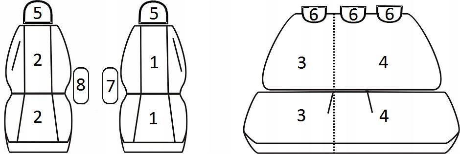 Zestaw pokrowców powstał na podstawie konkretnego modelu auta (rocznika) i pasuje tylko i wyłącznie do podanej powyżej konfiguracji siedzeń - nie jest to komplet uniwersalny. Profil, rozmiar oraz kształt foteli został uwzględniony podczas przygotowywania konkretnego produktu. Wszystkie typowe otwory zostały przygotowane i obszyte. Podłokietniki (o ile występują) zostały uwzględnione - w pierwszym rzędzie są osobne pokrowce, w kanapach zastosowano zamki błyskawiczne w odpowiednim miejscu (brak osobnego pokrowca na podłokietnik). Przednie fotele posiadają wszyte zamki błyskawiczne na plecach umożliwiające na korzystanie z kieszeni, dodatkowo w fotelu kierowcy (w siedzisku) przygotowano praktyczną kieszonkę na drobne przedmioty.