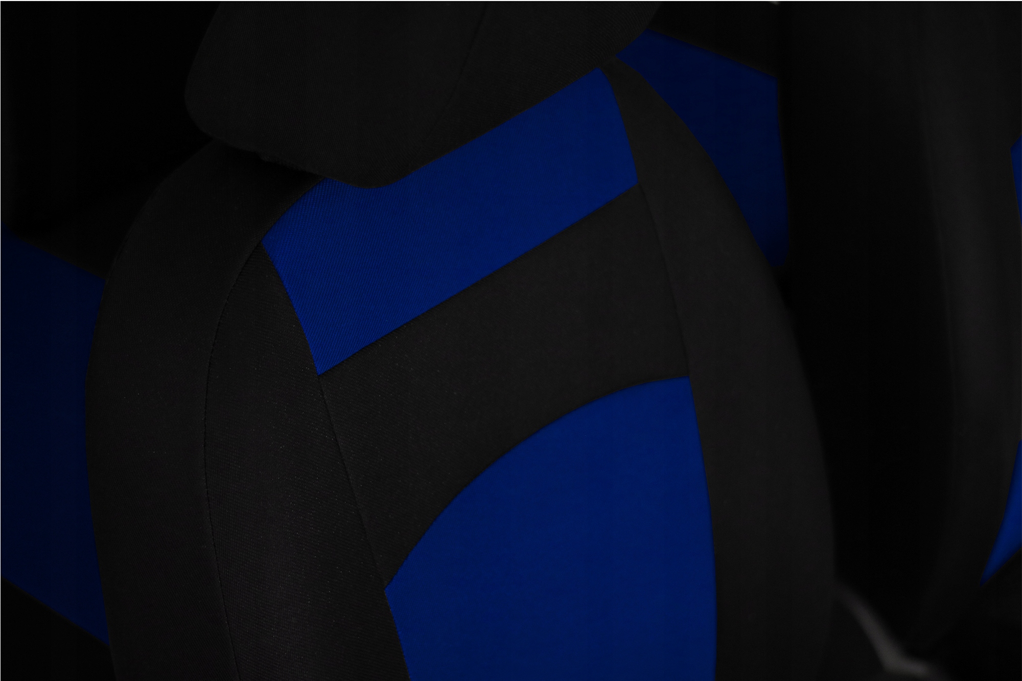 Oferowane pokrowce serii CLASSIC PLUS są polskim produktem wykonanym z dzianiny tapicerskiej (poliestrowej) w kolorze czarnym i z niebieskiego pasa środkowego. wyprodukowany z elastycznego, dobrze dopasowującego się materiału. Dodatkowo jest on podlaminowany pianką i podszewką, co zapobiega przesuwaniu się pokrowców na fotelach. Zdjęcia i zbliżenia (poglądowe) przedstawiające wzory i materiały dostępne w ofercie.