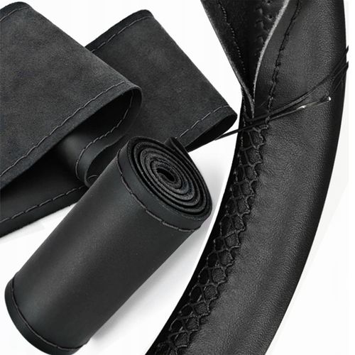 1. Nałożyć pokrowiec na kierownice w taki sposób aby łączenie skóry, znalazło się na dole i na środku kierownicy. Pokrowiec obszywamy od ramienia do ramienia, na początku należy odmierzyć odpowiednią długość załączonej do zestawu nitki. Mniej więcej jest to dwa razy tyle ile ma odcinek do obszycia, czyli od ramienia do ramienia.