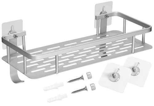 W zestawie: półka, dwa haczyki, dwie naklejki z klejem, dwa kołki montażowe, zaślepki, instrukcja