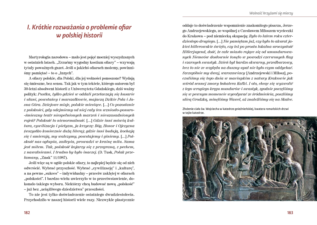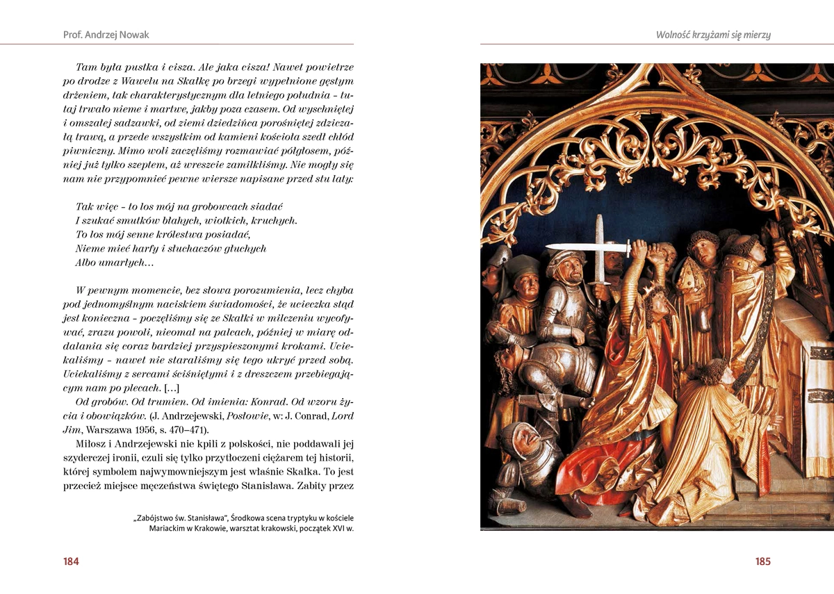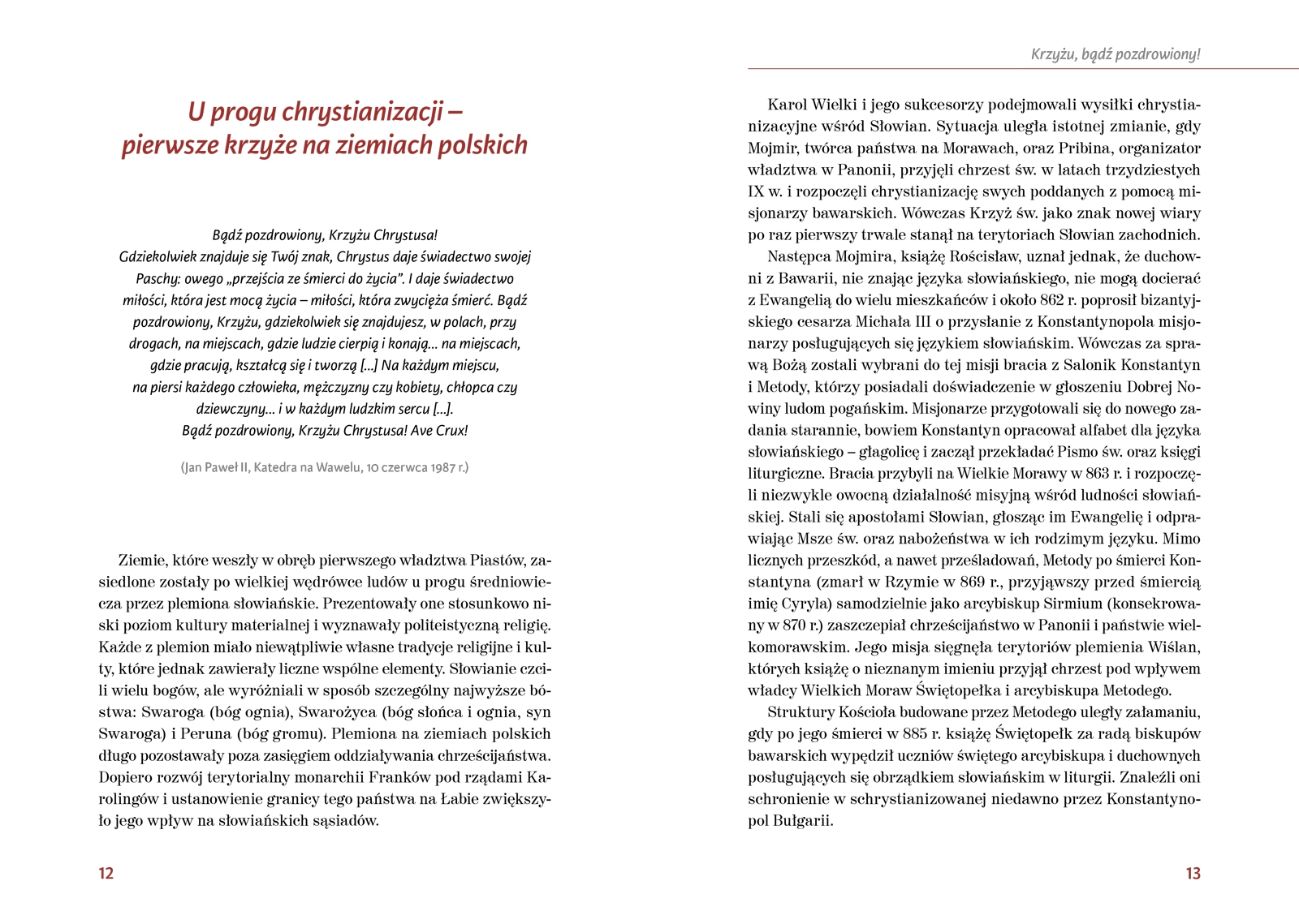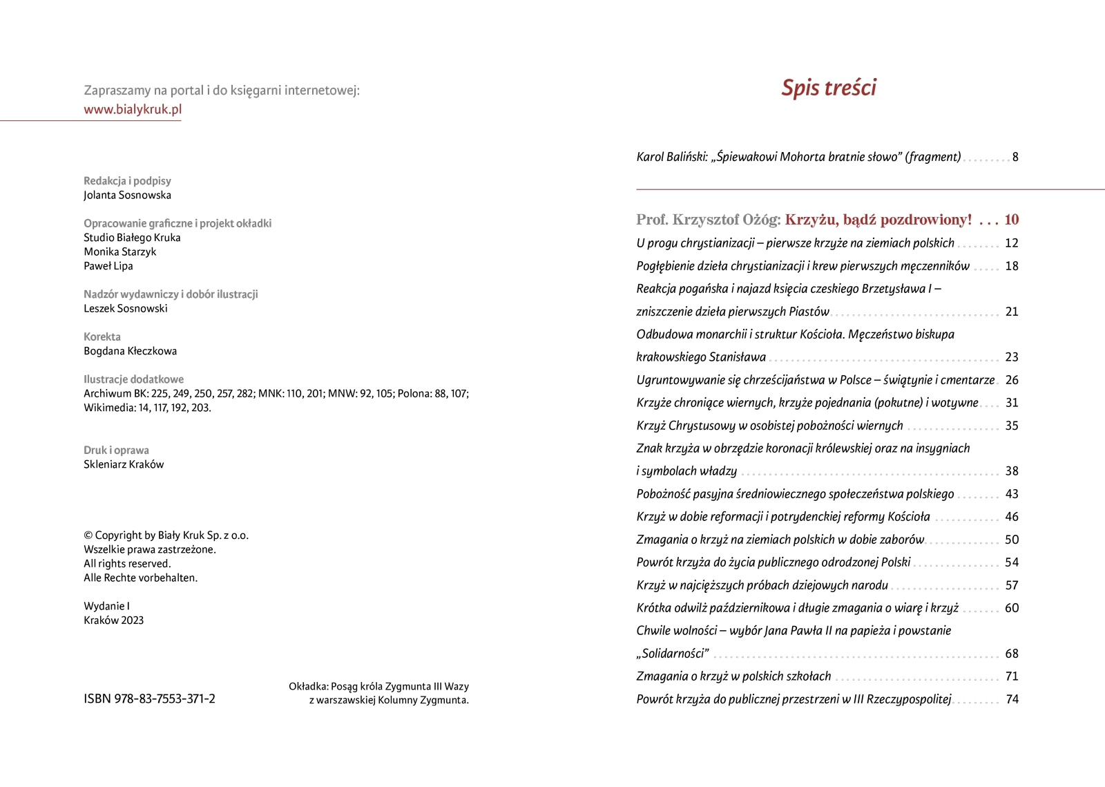Piękno, niezachwiana moc i potęga Krzyża. Związanie losów Rzeczypospolitej, od narodzin po dzień dzisiejszy, z Krzyżem oraz nieprzemijająca nadzieja pokładana w Chrystusie – to temat tej książki. Wybitni autorzy i uczeni, wielcy patrioci, utrwalają słowem, a mistrz Adam Bujak obrazem wizerunek Polski wiernej Bogu od jedenastu wieków. Bez chrześcijaństwa nie byłoby ani naszego państwa, ani naszego narodu. Krzyż od wieków funkcjonuje zarówno w duszy człowieka, jak i w przestrzeni publicznej – wywierając zbawienny wpływ w obu przypadkach. Połączenie słowa z obrazem, specjalność edytorska Białego Kruka, osiąga tu mistrzostwo. Teksty zapoznają nas nie tylko z ważnymi wydarzeniami historycznymi, ale także pomagają zrozumieć bogactwo ukrytych nieraz lub zapomnianych znaczeń ikonograficznych. Zdumiewa wielość i różnorodność form przedstawień Krzyża i Ukrzyżowanego. Mamy tu krzyże pasyjne, liturgiczne, ołtarzowe, brackie, pokutne, papieskie, herbowe, jako symbole władców itd. Krzyże w świątyniach, w polach, w rękach wiernych i utwierdzone na szczytach katedr lub pomników (jak np. uwidoczniony na okładce Zygmunt III stojący na kolumnie przed Zamkiem Królewskim w Warszawie). Krzyż Chrystusowy od początku stał się znakiem, któremu się sprzeciwiają. Tak bywało dawniej, tak jest i teraz, co w tej książce też zostało ukazane. Celem tej publikacji jest z jednej strony poszerzenie wiedzy historycznej i delektowanie się pięknem prezentowanych wybitnych dzieł sztuki, a z drugiej strony – obrona Krzyża. Zgodnie z tym, do czego wzywał nas wielki papież św. Jan Paweł II: „Brońcie Krzyża od Giewontu po Bałtyk! Brońcie Krzyża, nie pozwólcie, aby imię Boże było obrażane w waszych sercach, w życiu społecznym, rodzinnym”.