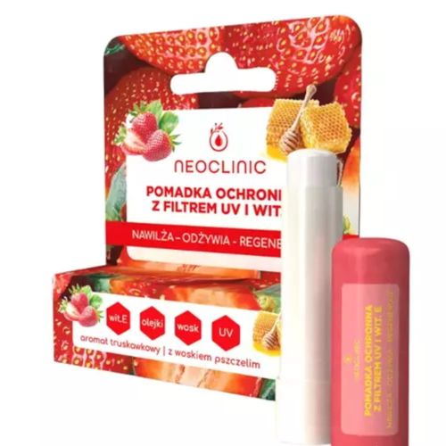 Neoclinic Pomadka ochronna z filtrem UV i witaminą E smak truskawka zapewnia intensywną pielęgnację oraz regenerację spierzchniętej i suchej skórze ust. Dodatkowo zawarte w kosmetyku filtry UV zabezpieczają usta przed szkodliwym działaniem słońca.