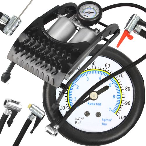 POMPKA NOŻNA SAMOCHODOWA DWU TŁOKOWA ROWEROWA 7 BAR MANOMETR W ZESTAWIE Z KOŃCÓWKAMI DO POMPOWANIA