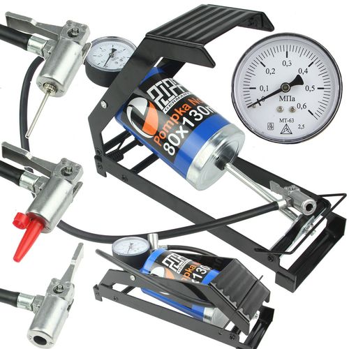 Pompka nożna z manometrem przeznaczona do pompowania samochodów, rowerów sprzętu sportowego i turystycznego.