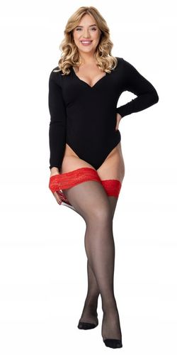 Czerwona, włoska koronka o szerokości 8 cm z podwójnymi paskami silikonu nie tylko nadaje pończochom niepowtarzalnego, zmysłowego wyglądu, ale także gwarantuje pewne trzymanie się na nogach, zapewniając wyjątkowy komfort przez cały dzień.