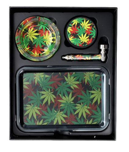 Zestaw prezentowy składający się z popielniczki, tacki, lufki oraz młynka, to idealne rozwiązanie dla miłośników relaksu i estetyki. Popielniczka, wykonana z wysokiej jakości szkła i metalu, zachwyca swoim eleganckim, wielokolorowym wzornictwem, inspirowanym motywami marihuany. Jej kompaktowe wymiary (9,5 x 7 x 3,7 cm) sprawiają, że doskonale wpasuje się w każdy kąt, a jej piękna forma doda klasy każdemu wnętrzu.