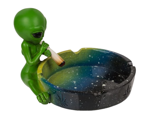 Oferujemy niezwykłą popielniczkę w futurystycznym stylu, która z pewnością przyciągnie uwagę każdego miłośnika oryginalnych akcesoriów. Produkt przedstawia zabawnego kosmitę siedzącego obok statku kosmicznego, który trzyma jointa, co czyni go idealnym elementem dekoracyjnym dla osób z zamiłowaniem do science fiction.