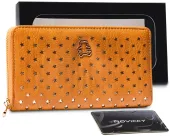 Elegancki, obszerny portfel z eko-skóry w złotym odcieniu, z subtelnym, ażurowym wzorem gwiazd. Bezpieczny zamek błyskawiczny utrzymuje zawartość w porządku. W środku praktyczne przegrody na karty, specjalna kieszeń na dokumenty i dedykowane przestrzenie na banknoty.