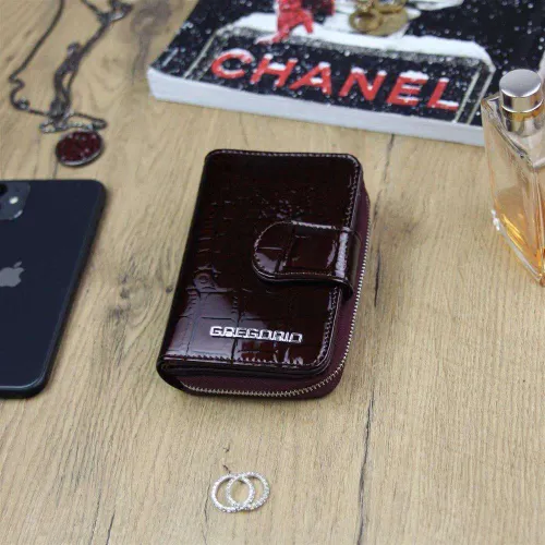 Ciemny brązowy lakierowany portfel damski Gregorio prezentuje się bardzo elegancko i klasycznie. Jego wyjątkowy design i lakierowany efekt nadają mu niepowtarzalnego uroku, który pasuje do różnych stylizacji i okazji. To doskonałe uzupełnienie zarówno eleganckich, jak i codziennych looków.