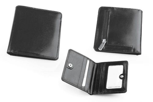 Portfel posiada dwie przegrody na banknoty, sześć miejsc na karty lub wizytówki oraz okienko ID na dokumenty.