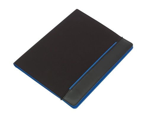 Z notesem, wsuwanymi kieszonkami, pętelkami na długopis i inne akcesoria, zamykane gumką.