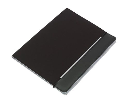 Z notesem, wsuwanymi kieszonkami, pętelkami na długopis i inne akcesoria, zamykane gumką.