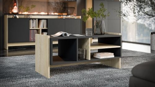 PORTO STOLIK KAWOWY to doskonały wybór dla tych, którzy pragną wprowadzić do swojego salonu odrobinę stylu oraz komfortu. Jego elegancki design łączy w sobie klasykę z nowoczesnością, a połączenie dębu Cremona z czarnymi frezowanymi frontami tworzy wyjątkowy klimat, który przyciąga spojrzenia.