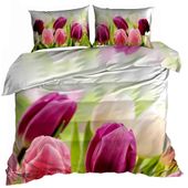 Pościel przedstawiająca różowe tulipany w jednym rogu pościeli oraz na dole każdej poduszki.