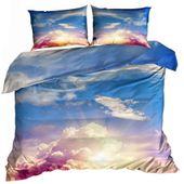 Pościel przedstawiająca pogodne niebo, rozświetlone ciepłem wschodzącego słońca oraz wzbogacone delikatnymi obłoczkami.