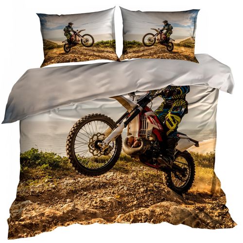 Pościel bawełniana przedstawiająca motor crossowy jadący po nierównym terenie.