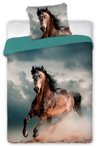 Pościel 3D 140x200 dziecięca z wysokiej jakości bawełny. Dzięki nowoczesnej technologii nadruku wzór na pościeli jest niezwykle wyraźny i trwały, a tkanina gładka i jednolita. Kolory są nasycone i nie bledną, nawet po wielu praniach. Dominującym kolorem pościeli jest: odcienie beżu, brązu i szarości. Pościel dziecięca konie jest miła w dotyku, nadruk nie powoduje efektu szorstkości jak ma to miejsce w tanich pościelach.