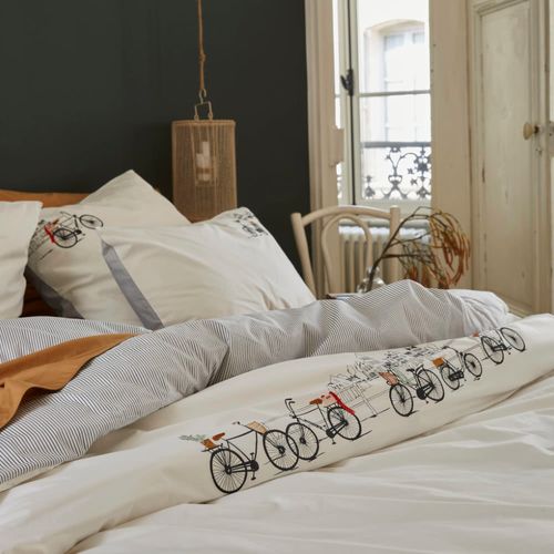 Każda przejażdżka na rowerze po ulicach Amsterdamu może stać się rzeczywistością dzięki tej zasypiającej pościeli, która przeniesie Cię do urokliwej scenerii miasta, gdzie domy w tradycyjnej holenderskiej architekturze łączą się z pięknem natury. Granatowy haft z akcentami różu, czerwieni, karmelu i szałwii sprawia, że pościel zyskuje na elegancji i stylu, natomiast rewers z delikatnymi niebieskimi i białymi paskami nadaje jej nowoczesnego, miejskiego charakteru.