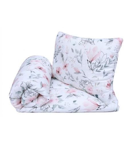 Komplecik składa się z poduszki i kołderki, które posiadają ciepłe, antyalergiczne wypełnienie silikonowe na stałe zszyte z materiałem. Rozwiązanie to jest bardzo higieniczne i praktyczne, sprawdzi się w domu,na wyjazdach oraz w przedszkolu.
