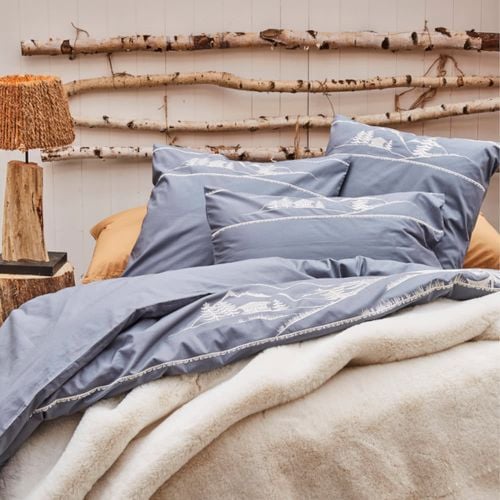 Ekskluzywna pościel Chalet d'alpage Sylvie Thiriez z motywem tradycyjnej alpejskiej wioski wyhaftowanym na szaro-niebieskim tle. Użyta w produkcji wysokiej jakości bawełna perkalowa o niesamowitej miękkości przypomina satynę bawełnianą. Ma bardzo gęstą strukturę, dzięki czemu, nadaje się idealnie przy kołdrach z pierza – ani jedno piórko nie wnika w powierzchnie. Produkt posiada certyfikat Oeko Tex Standard. Nadaje się do prania w pralce w temperaturze do 60°C oraz do suszenia w suszarce bębnowej na delikatnym programie. Pościel dostępna jest w wariantach dla kołdry 160×200 lub 220×200 oraz dla poduszek w rozmiarze 50×70 cm.