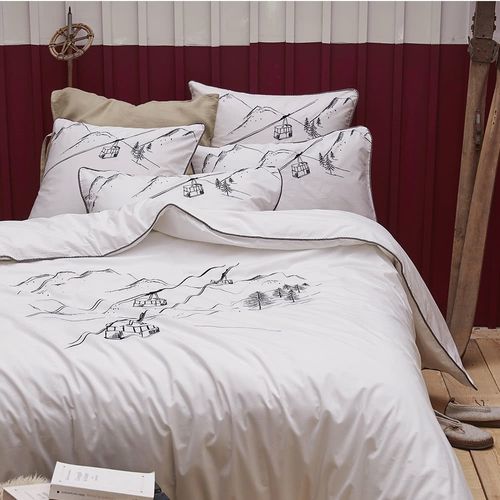 Pościel En piste Sylvie Thiriez z czarną lamówką i wyhaftowanym motywem zimowych grzbietów górskich oraz kolejki linowej. Inspiracją dla tej kolekcji są sporty zimowe: zapierający dech w piersiach krajobraz wyhaftowany w kolorze czarnym. Pościel została wykonana z trwałej czesanej bawełny o gęstości 80 nitek/cm². To oznacza, że tkanina jest bardzo gęsto tkana, wytrzymała a zarazem miękka. Dzięki temu, nada się idealnie przy kołdrach z pierza - ani jedno piórko nie wnika w powierzchnie. Pościel dostępna jest w wariantach dla kołdry 140x200, 160×200 lub 220×200 oraz dla poduszek w rozmiarze 50×70 cm. Produkt posiada certyfikat Oeko Tex Standard. Nadaje się do prania w pralce w temperaturze do 60°C oraz do suszenia w suszarce bębnowej na delikatnym programie.
