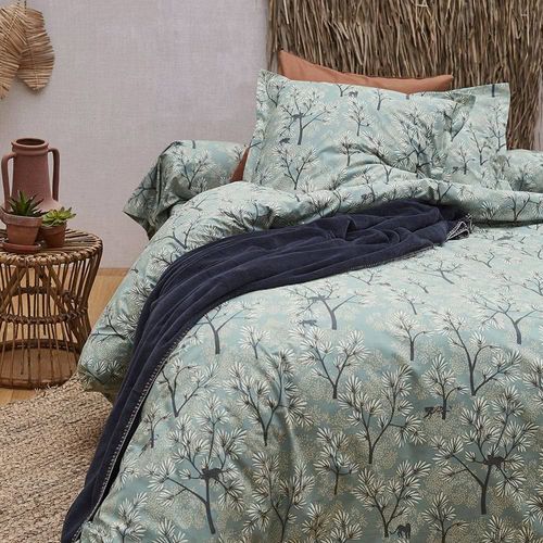 Piękna, ozdobna pościel Java Silvie Thiriez nadrukowana egzotycznym wzorem panter, chowających się w kwitnącej roślinności tle w kolorze morskiej zieleni. Pościel bawełniana składa się z kompletu poszewek na kołdrę i poduszkę dostępna jest w wariantach dla kołdry 140×200 lub 220×200 oraz dla poduszek w rozmiarze 50×70 cm. Tkanina przypomina satynę bawełnianą - posiada subtelny połysk. Została wykonana z gęsto tkanych nici w ilości aż 80 nitek/cm². Dzięki temu nie pozwala przedostać się na zewnątrz wypełnieniu kołdry z pierza. Poszewki na poduszki ozdobione są szeroką żakardową falbaną. Produkt posiada certyfikat Oeko Tex Standard. Nadaje się do prania w pralce w temperaturze do 60°C oraz do suszenia w suszarce bębnowej na delikatnym programie.