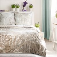 Dwustronny nadruk – z jednej strony romantyczne liście/palmy, z drugiej stonowany motyw geometryczny – pozwala łatwo odmienić wystrój sypialni bez wymiany kompletu. Kolory: beżowo‑popielate tonacje wpisują się w styl skandynawski, boho i klasyczny.