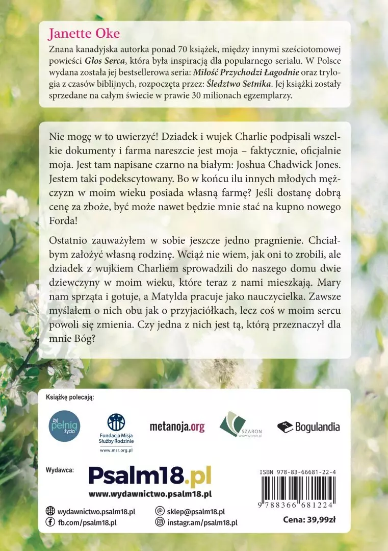 Nie mogę w to uwierzyć! Dziadek i wujek Charlie podpisali wszelkie dokumenty i farma nareszcie jest moja – faktycznie, oficjalnie moja. Jest tam napisane czarno na białym: Joshua Chadwick Jones. Jestem taki podekscytowany. Bo w końcu ilu innych młodych mężczyzn w moim wieku posiada własną farmę? Jeśli dostanę dobrą cenę za zboże, być może nawet będzie mnie stać na kupno nowego Forda! Ostatnio zauważyłem w sobie jeszcze jedno pragnienie. Chciałbym założyć własną rodzinę. Wciąż nie wiem, jak oni to zrobili, ale dziadek z wujkiem Charliem sprowadzili do naszego domu dwie dziewczyny w moim wieku, które teraz z nami mieszkają. Mary nam sprząta i gotuje, a Matylda pracuje jako nauczycielka.Zawsze myślałem o nich obu jak o przyjaciółkach, lecz coś w moim sercu powoli się zmienia. Czy jedna z nich jest tą, którą przeznaczył dla mnie Bóg? O serii Akcja dzieje się na amerykańskiej farmie, na początku XX wieku. Josh Jones zdaje sobie sprawę, że jego rodzina nie jest typowa, ale to jedyne życie, jakie kiedykolwiek poznał. Ciocia Lou, dziadek, wujek Charlie i pradziadek- wszyscy ukształtowali młodego mężczyznę, jakim się stał. Ale kiedy dorasta, Josh zaczyna stawiać czoła ważnym pytaniom dotyczącym życia, miłości i wiary. Trzy miliony książek sprzedanych w serii (na świecie). Janette Oke – znana kanadyjska autorka ponad 70 książek, między innymi sześciotomowej powieściGłos serca(na jej podstawie nakręcono znany w Polsce serial). W Polsce wydana została także jej bestsellerowa seria: „Miłość przychodzi łagodnie” oraz trylogia z czasów biblijnych rozpoczęta przez: Śledztwo setnika. Jej książki zostały sprzedane na całym świecie w prawie 30 milionach egzemplarzy.