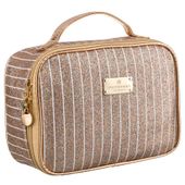 Stylowa kosmetyczka z czarnego materiału pokrytego drobnym, połyskującym brokatem. Uchwyt i lamówka w kolorze różowego złota podkreśla elegancki wygląd. Detale takie jak okrągłe, metalowe zawieszki ozdobne w złotym kolorze nadają produktowi luksusowy charakter.