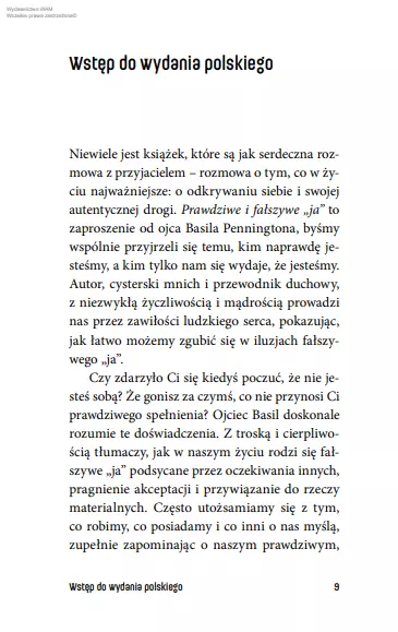 Czy kiedykolwiek czułeś, że nie jesteś sobą? Masz wrażenie, że gonisz za czymś, co nie przynosi prawdziwego spełnienia? Chcesz uzdrowić bolesne wspomnienia, by nie ograniczały, ale prowadziły do wzrostu? Pragniesz uniezależnić się od oczekiwań podsycanych przez innych? Żeby zgłębić prawdę o sobie, trzeba wyruszyć w duchową podróż, która jest jednocześnie powrotem do swojego autentycznego „ja” głęboko zakorzenionego w Bożej obecności w nas. Ojciec M. Basil Pennington, mnich i propagator modlitwy głębi, wyjaśnia, że kluczem do tej przemiany jest kontemplacja, która pozwala nam uwolnić się od natłoku myśli i otworzyć się na bezpośrednie doświadczenie Boga. Prowadzeni przez Ducha Świętego odkrywamy, że nasza wartość nie zależy od tego, co robimy, ale od tego, kim jesteśmy w Bożych oczach. Stwórca prowadzi nas do pełni poznania naszego prawdziwego „ja”, do odrzucenia fałszywego obrazu siebie samych i odkrycia swej niepowtarzalności. Uniezależniając się od opinii innych i własnych wyobrażeń na swój temat, możemy się rozwijać, doświadczać wolności i odnosić się życzliwie do otaczającej nas rzeczywistości. Ponieważ zostaliśmy stworzeni na obraz Boży, jakkolwiek byłby on teraz zniekształcony i zamazany, wciąż pozostajemy najlepszym sposobem na dowiedzenie się czegoś o Bogu, który nas stworzył. Im lepiej znamy samych siebie, w tym lepszym jesteśmy kontakcie z naszymi najgłębszymi i najbardziej autentycznymi aspiracjami. (1931–2005) – trapista, od 2001 roku opat Opactwa Matki Bożej od Ducha Świętego w Conyers (USA). Studiował teologię i prawo kanoniczne w Rzymie, uczestniczył w pracach Drugiego Soboru Watykańskiego. Znany jest przede wszystkim jako krzewiciel duchowości kontemplacyjnej.