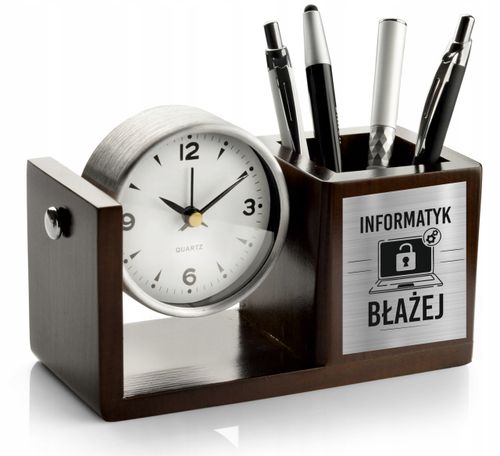Elegancki i praktyczny zegar z organizerem na biurko, wykonany z wysokiej jakości drewna z metalowymi elementami. Połączenie estetyki i funkcjonalności sprawia, że to idealny prezent dla każdego. Taki gadżet nie tylko zdobi biurko, ale także ułatwia codzienną organizację pracy.