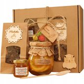 Ten starannie przygotowany zestaw prezentowy łączy w sobie wielokwiatowy miód z polskiej pasieki (40ml), aromatyczną herbatę hibiskus (40g) o intensywnej barwie i orzeźwiającym smaku oraz naturalne cytryny w syropie z goździkami (260ml) od renomowanej firmy Spichlerz. Każdy składnik został wyselekcjonowany pod kątem najwyższych standardów jakościowych.